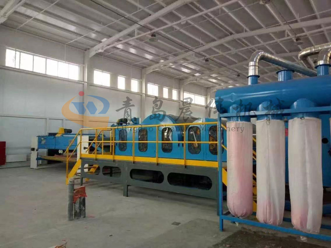 2. CWKS-開松機:各種不同纖維被放入水平輸送簾,經壓棉輥和對輥羅拉喂入,經高速打手開松后經輸棉風機以適量的風量輸送纖維原料供后道工作使用;并配備橋式除鐵裝備。開松效果好,不易纏棉,產量高。