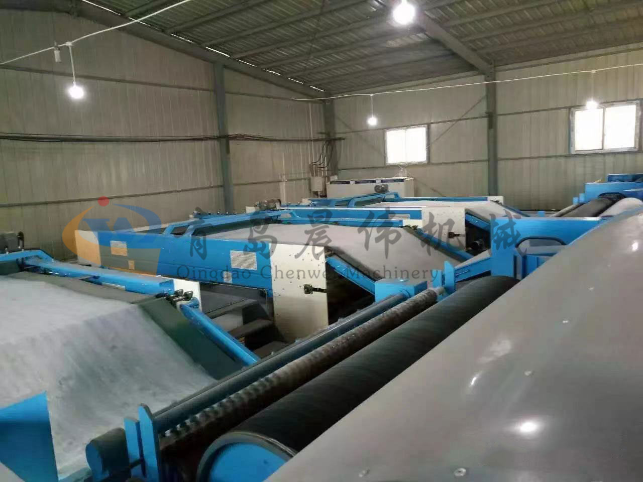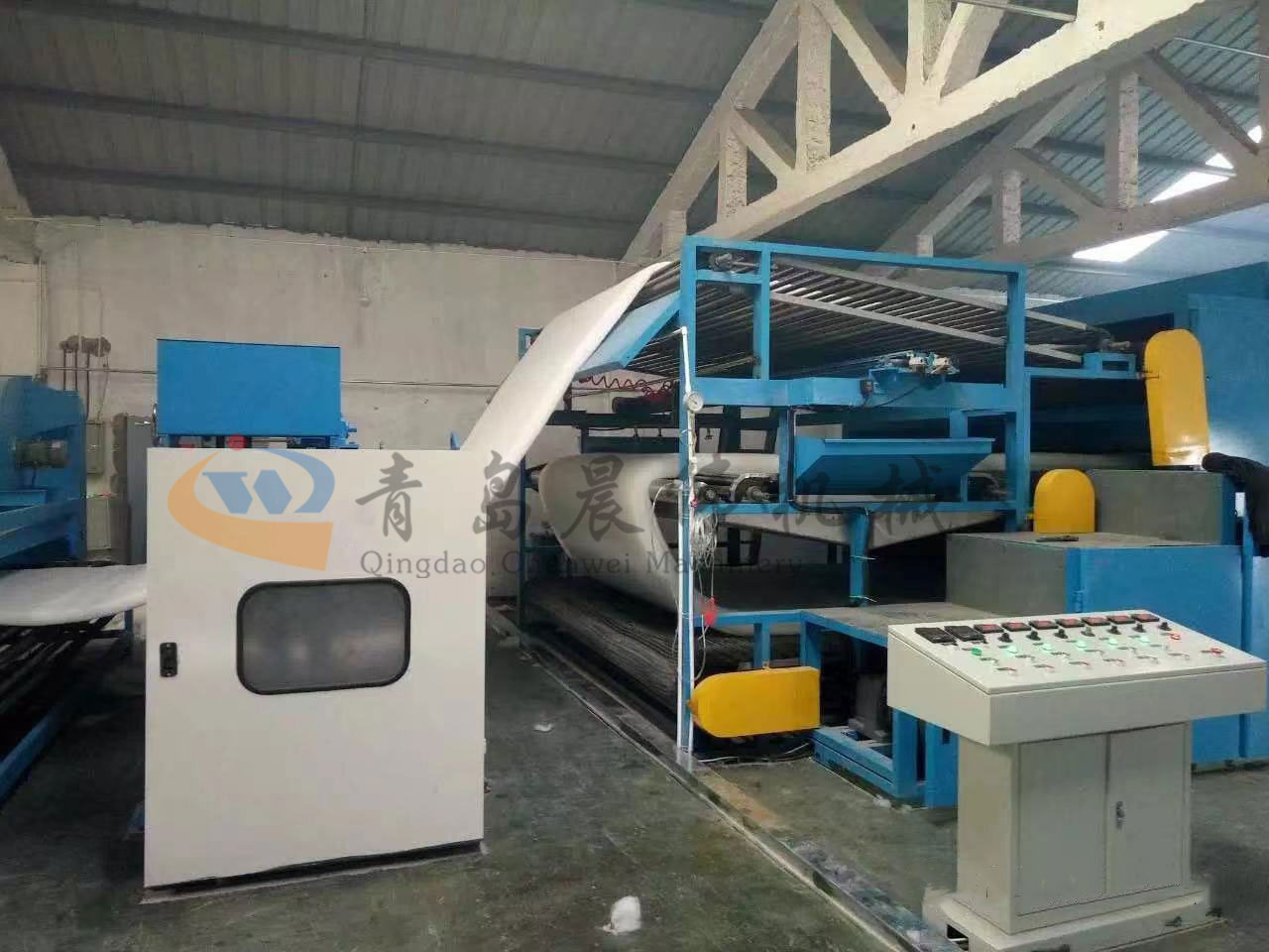 5. CWPW-鋪網(wǎng)機(jī):用于將梳理纖網(wǎng)通過(guò)移動(dòng)小車交叉折疊為所需幅寬和定量的多層纖網(wǎng),以供后道工序使用。鋪網(wǎng)輥采用特殊結(jié)構(gòu),加裝壓網(wǎng)輥和導(dǎo)流板,不飄網(wǎng)不起皺,五只大功率電機(jī)精確控制各部件的運(yùn)動(dòng),電動(dòng)輸出簾高度調(diào)節(jié)裝置