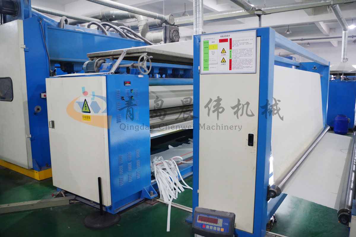 5. CWPW-鋪網(wǎng)機(jī):用于將梳理纖網(wǎng)通過移動(dòng)小車交叉折疊為所需幅寬和定量的多層纖網(wǎng),以供后道工序使用。鋪網(wǎng)輥采用特殊結(jié)構(gòu),加裝壓網(wǎng)輥和導(dǎo)流板,不飄網(wǎng)不起皺,五只大功率電機(jī)精確控制各部件的運(yùn)動(dòng),電動(dòng)輸出簾高度調(diào)節(jié)裝置