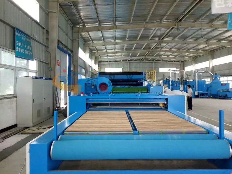 5. CWPW-鋪網(wǎng)機(jī):用于將梳理纖網(wǎng)通過(guò)移動(dòng)小車(chē)交叉折疊為所需幅寬和定量的多層纖網(wǎng),以供后道工序使用。鋪網(wǎng)輥采用特殊結(jié)構(gòu),加裝壓網(wǎng)輥和導(dǎo)流板,不飄網(wǎng)不起皺,五只大功率電機(jī)精確控制各部件的運(yùn)動(dòng),電動(dòng)輸出簾高度調(diào)節(jié)裝置